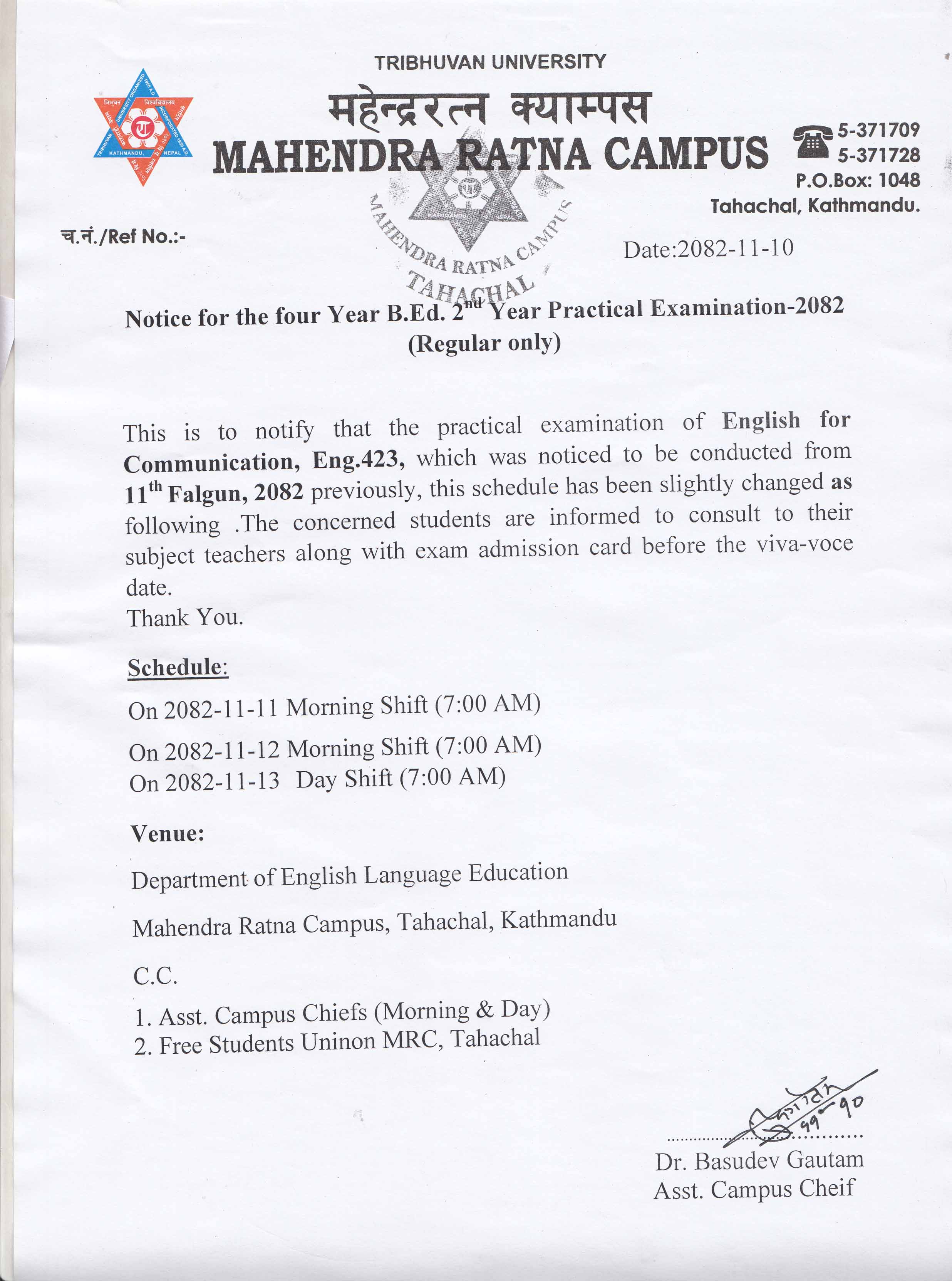 Notice for b.ed 2nd year english practical exam