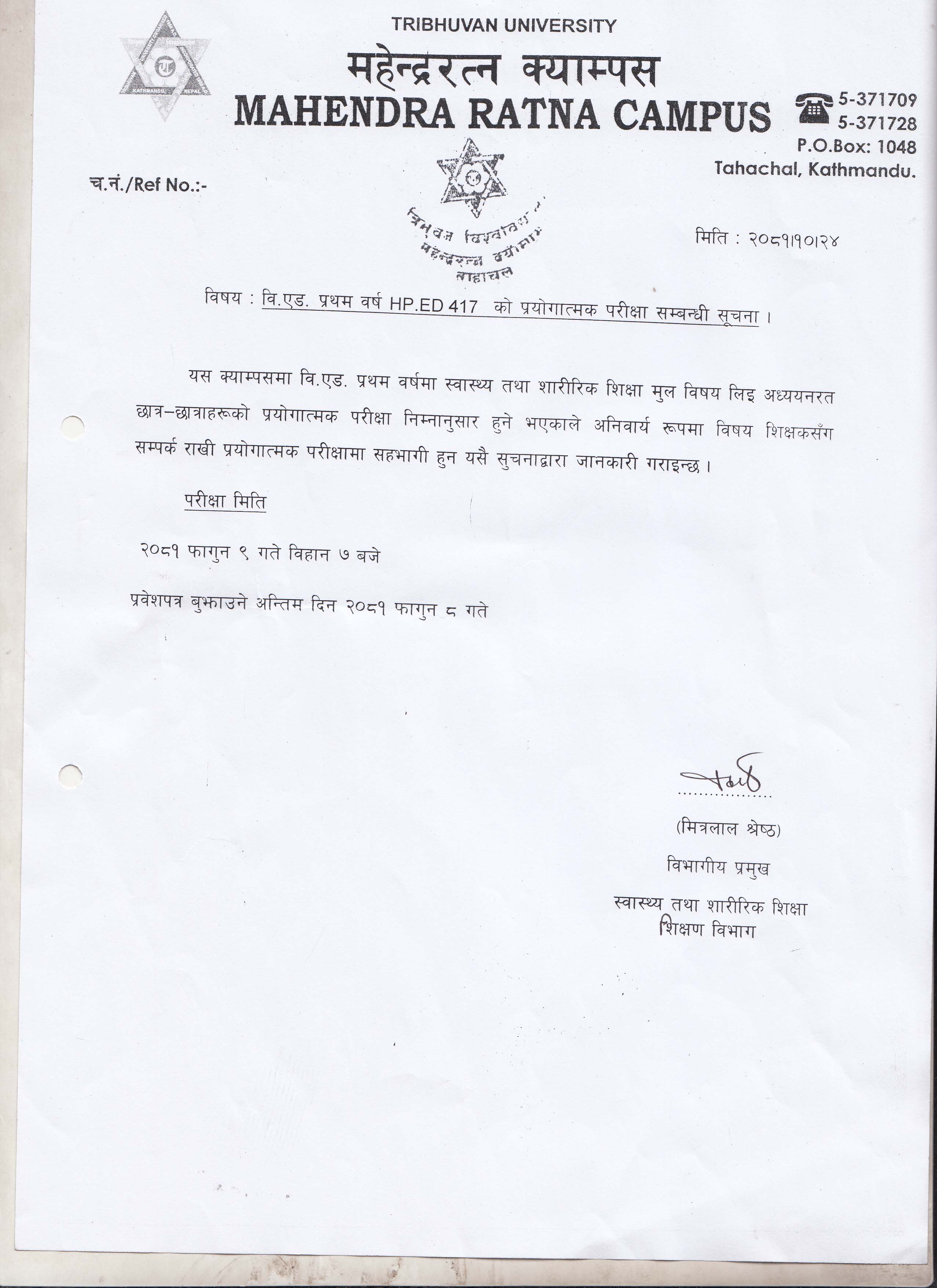 Notice for b.ed 2nd year english practical exam