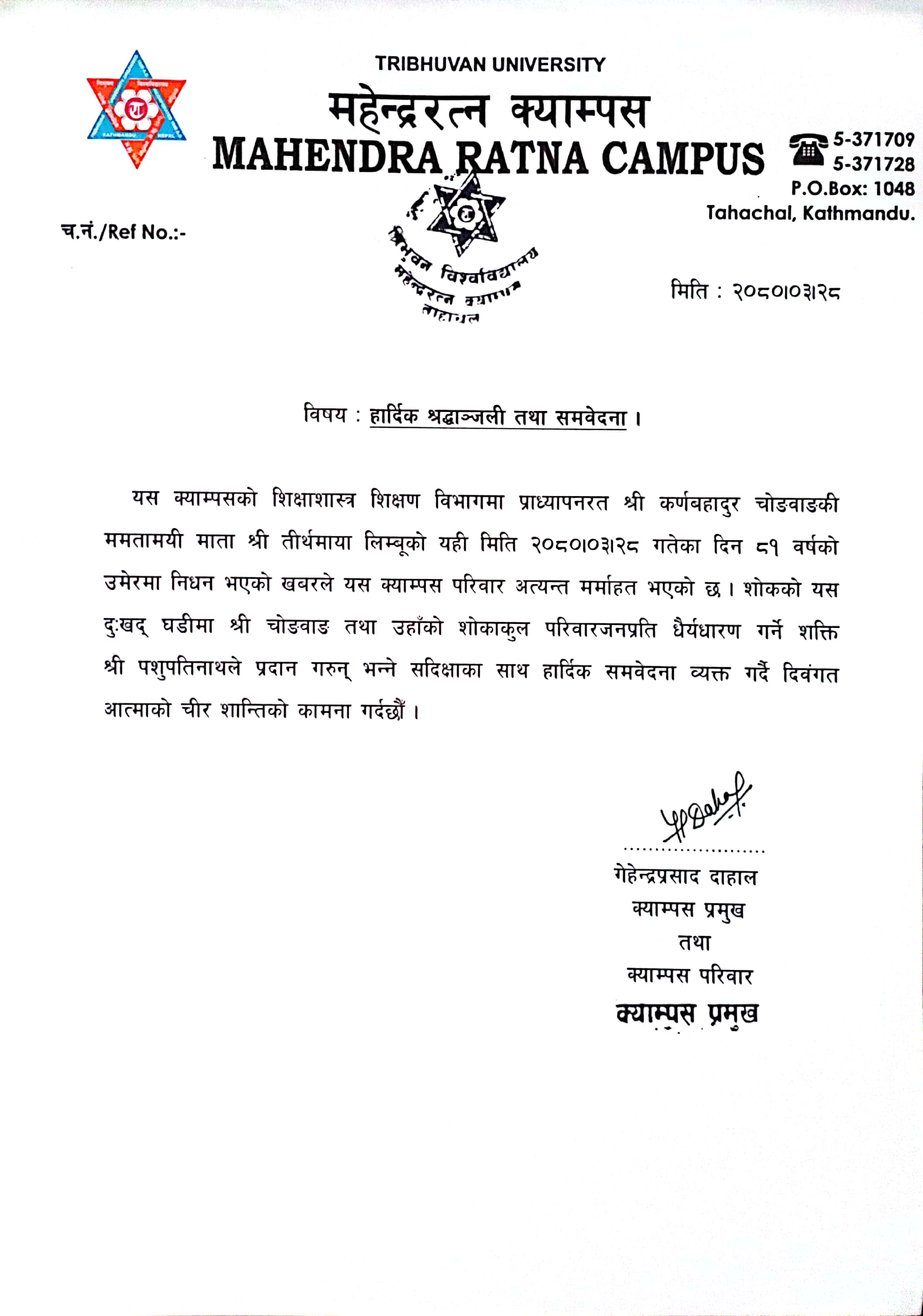 हार्दिक श्रदाञ्जती तथा समवेदना