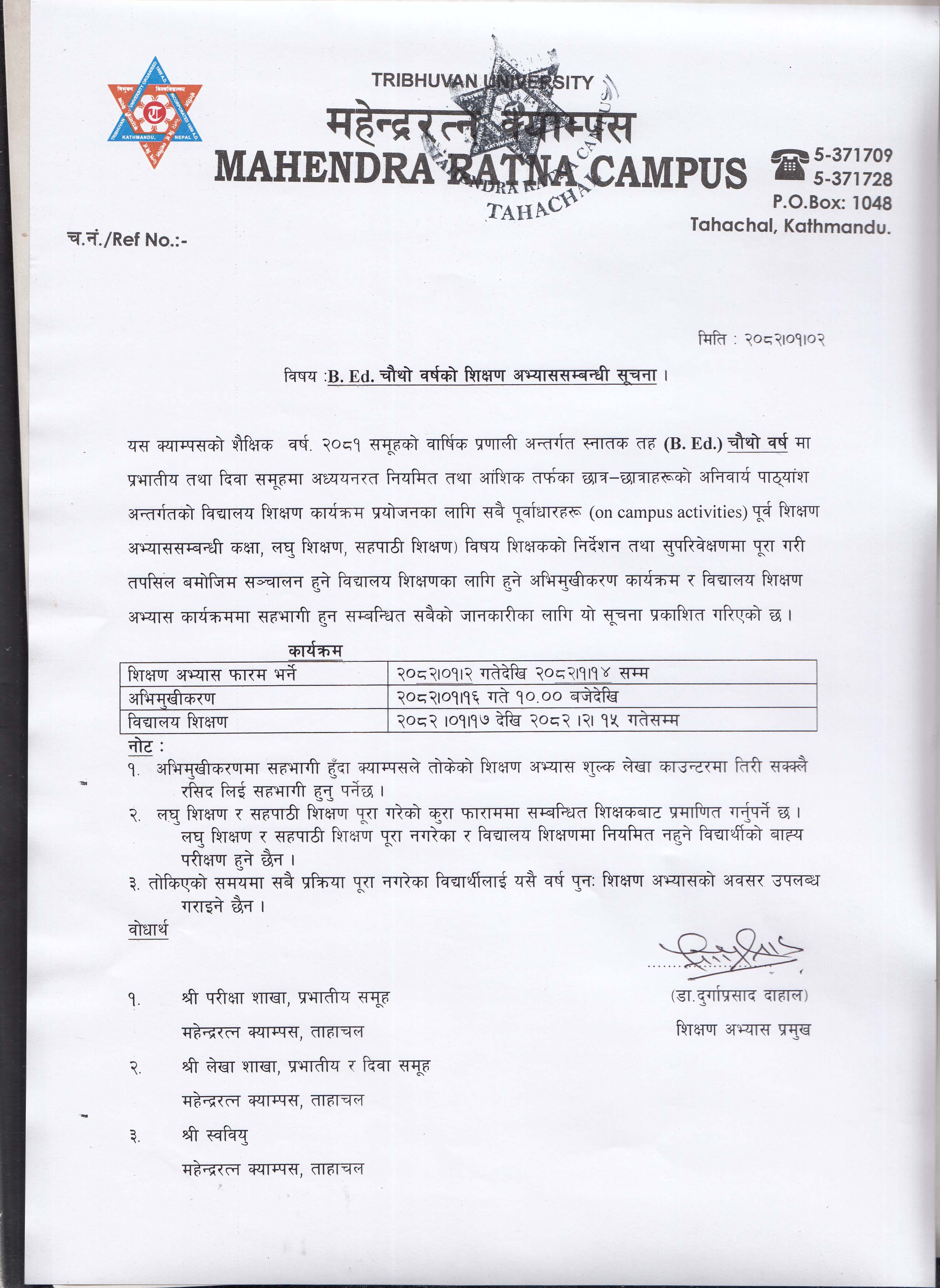 B.ED चौथो वर्षको शिक्षण अभ्याससम्बन्धी सूचना