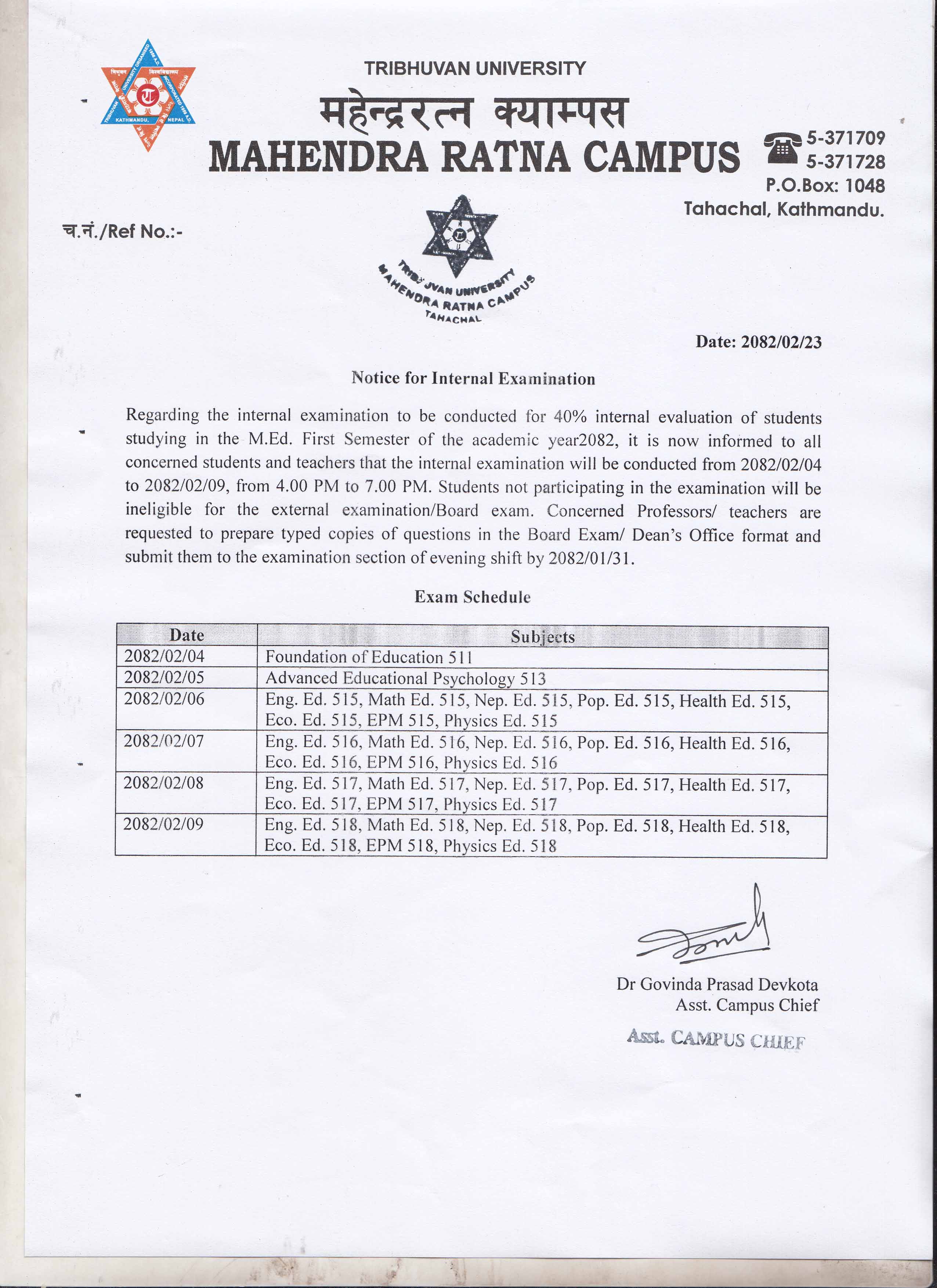 Notice for internal exam M.Ed 1st semester